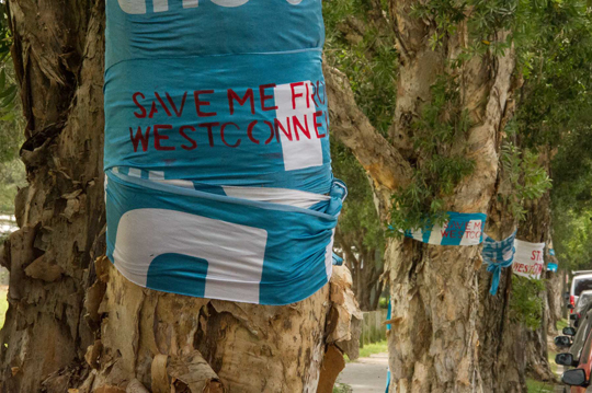 Image 1. Trees on Euston Rd alongside Sydney Park. Residents wrapped the trees in blue ribbon in late 2015 to raise awareness of their imminent destruction. Photo: ©lorrie graham photographer